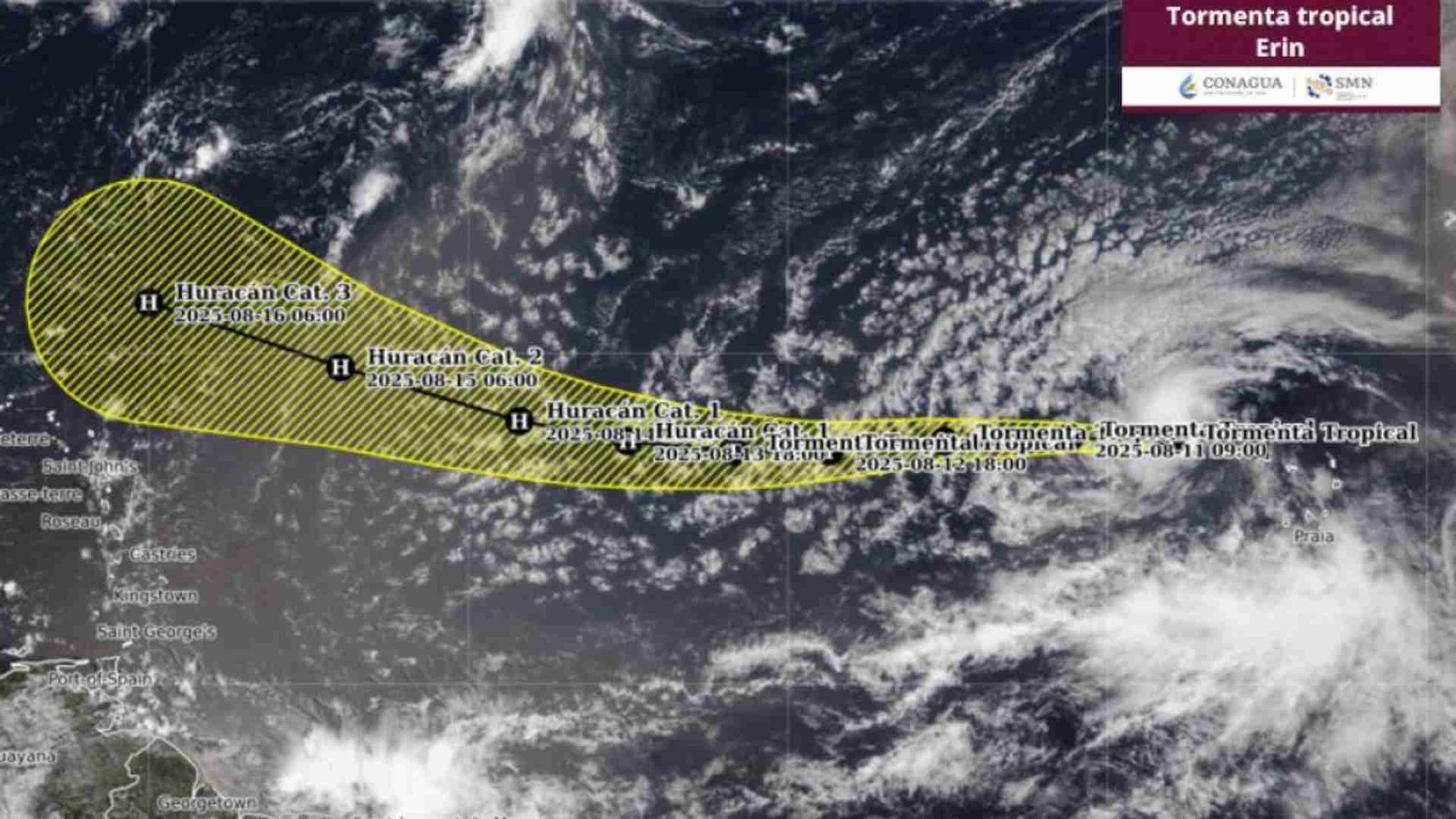De acuerdo con los últimos informes de la Comisión Nacional del Agua (Conagua), la tormenta “Erin” se mantiene a 6 mil 160 km al este de Cancún, Q. Roo, y se pronostica que cuando se convierta a huracán de categoría 3, alcance los 2 mil 780 km al este de Cancún.