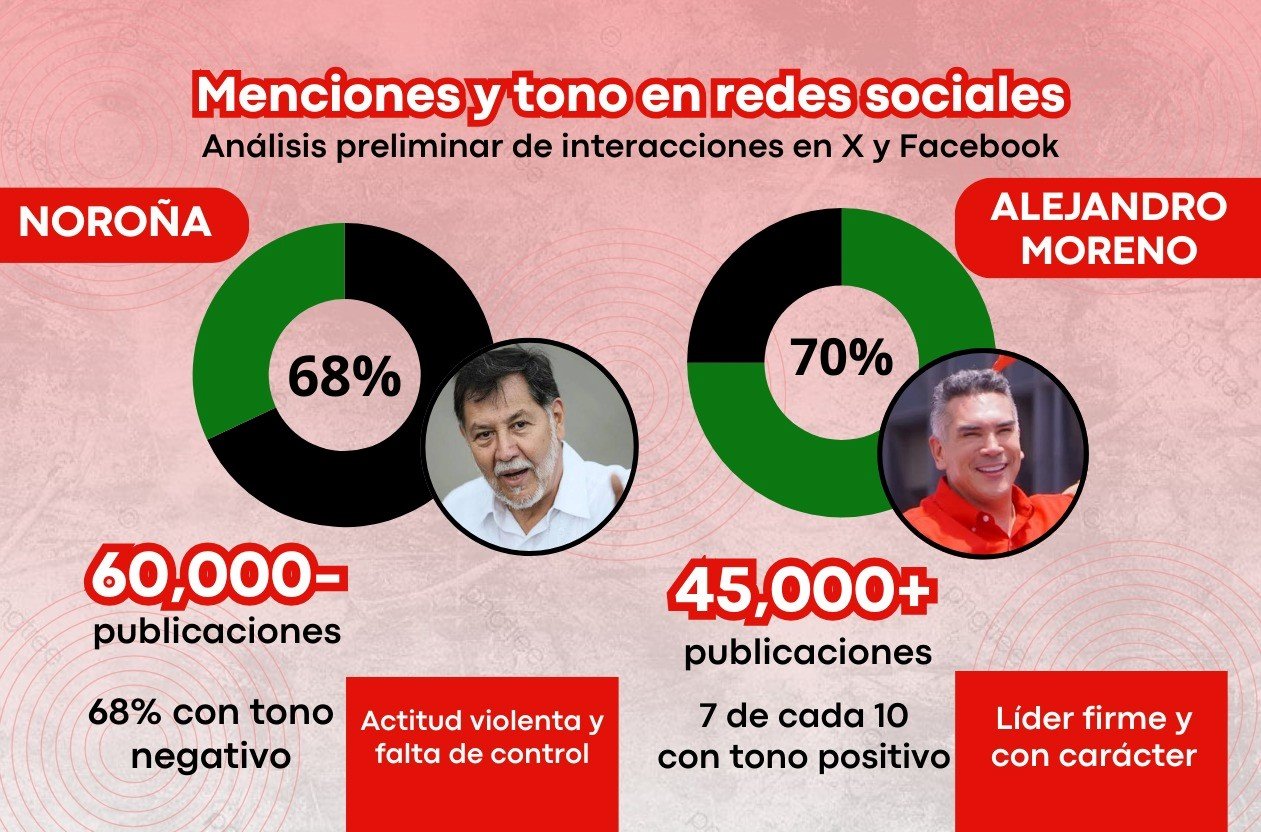 Las métricas de alcance también evidencian la brecha: mientras las publicaciones vinculadas a Noroña generaron un alto nivel de rechazo, con apenas un 22% de interacciones favorables, las que mencionaban a Moreno alcanzaron un potencial de más de 12 millones de visualizaciones en menos de un día, con cifras cercanas a 150 mil interacciones positivas en X y más de 800 mil reproducciones en videos de Facebook que replicaron su intervención.