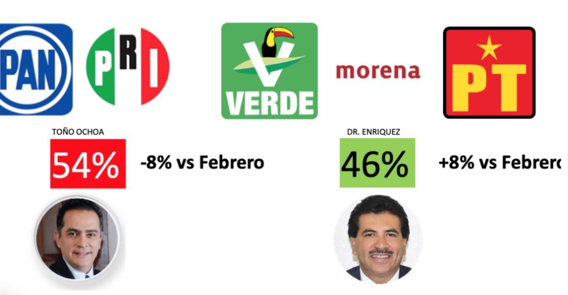 La encuesta también reveló un dato alentador para la alianza PRI-PAN: aunque la coalición oficialista mantiene una ligera ventaja en simpatía general (44%), la fórmula opositora logró un crecimiento constante durante marzo, alcanzando ya el 40 por ciento en la intención de voto. Este repunte refleja el respaldo ciudadano al trabajo cercano y los resultados que Toño Ochoa ha ofrecido a lo largo de su gestión.